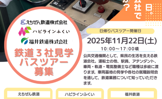 2025/11/22 鉄道3社見学ツアー 2025年10月24日 えちぜん鉄道・福井鉄道・ハピラインふくいの3社を見学します。 鉄道業務の魅力に触れてみませんか? 【開催日】2025年1… Read more